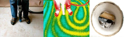 Ist der Schaden da, muß fast immer technisch getrocknet werden, um Pilzbildung vorzubeugen. Hierzu werden ggf. Löcher in den Fußboden gebohrt, durch die warme Luft eingeblasen wird. Die feuchte Luft tritt an vorher freigelegten Fugen wieder aus und wird mit Kondenstrockner getrocknet. Heute werden Leitungen verdeckt verlegt. Fußbodenheizungen sind Standard. Es leuchtet ein, daß beim Bohren im Estrich Gefahr der Beschädigung besteht. Nach meinen Erfahrungen “ziehen diese den Bohrer magisch an”. Dann kommt die Minute der Wahrheit für den Thermografen beim Durchdringen des Estrichs. Aus eigener Erfahrung kann ich sagen, daß bei schlechter Zirkulation (Luft in der Heizschlange) schon mal ein kalter Rücklauf übersehen werden kann. Das Ergebnis sieht dann wie im Foto rechts gezeigt aus. Hierzu ist zu bemerken, daß alle Leitungen scheinbar eindeutig sichtbar waren. Auch die Abstände waren für eine Fußbodenheizung o.k. Die Bohrung wurde exakt mittig zwischen den sichtbaren Heizschlangen eingebracht. Das war ein Fehler. Tip: Immer unmittelbar neben dem sichtbarem Rohr und nicht in der Mitte zwischen den Leitungen bohren !