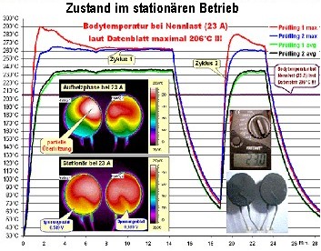 ![]() PDF-Datei zum Thema Frage zum Thema stellen Elektronische Bauteile werden immer leistungsfähiger. Oft ist damit erhöhte thermische Belastung der Komponenten und deren Umgebung verbunden. Prominentes Beispiel sind die superschnellen CPU´s, die mehr als 80 Watt Verlustleistung auf einem kleinen Chip erzeugen. Häufig geht es darum, ob technische Parameter eingehalten werden. Hier am Beispiel der Einschaltstrombegrenzer für Schaltnetzteile von Dialysegeräten: Der Auftraggeber hatte mit Anlegefühler und Handpyrometer gemessen. Die Ergebnisse streuten stark, wiesen aber eindeutig, gegenüber dem Datenblatt zu hohe Oberflächentemperatur auf. Warum die Werte streuten, ist am Wärmebild ersichtlich. Die Temperaturverteilung auf den scheibenförmigen Bauteilen war keineswegs homogen und von Teil zu Teil unterschiedlich. Der Nennstrom lag bei 23 A. Es handelt sich um Heißleiter, die zunächst hochohmig sind und dadurch den Anlaufstrom begrenzen. Durch den Stromfluß erwärmen sie sich und werden niederohmig, im Beispiel ~0,02 Ohm. Hierbei verschwindet auch der Hot Spot. |