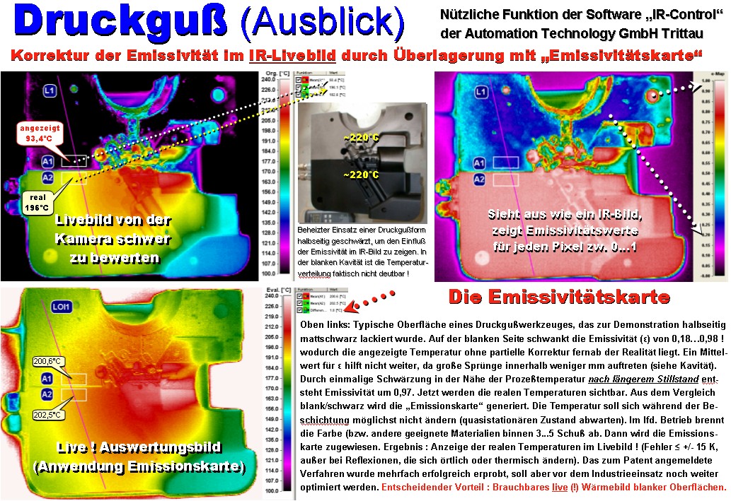 Foto links: Typische Oberfläche einer Druckgußform, die zur Demonstration halbseitig schwarz lackiert ist. Auf der blanken Seite schwankt die Emissivität (ε) von 0,18…0,98 ! wodurch die im IR-Bild links gezeigte Temperatur ohne Korrektur fernab der Realität liegt. Ein Mittelwert für ε hilft nicht, da extreme Sprünge binnen weniger mm auftreten (siehe Kavität). Durch einmalige Schwärzung nahe der Prozeßtemperatur nach längerem Stillstand entsteht homogene Emissivität um 0,97. Jetzt zeigt sich die reale Temperatur. Aus dem Vergleich blank/schwarz wird mit der IR-Control Software der Automation Technology GmbH in Trittau die „Emissionskarte“ generiert. Die Temperatur soll sich während der Beschichtung möglichst nicht ändern (quasistationären Zustand abwarten). Im lfd. Betrieb brennt die Farbe, bzw. andere geeignete Materialien binnen 3...5 Schuß ab. Dann wird die Emissionskarte zugewiesen. Ergebnis: Anzeige der realen Temperaturen im Livebild ! (Fehler ≤ +/- 15 K, außer Reflexionen, die sich örtlich oder thermisch ändern). Das zum Patent angemeldete Verfahren wurde mehrfach erfolgreich erprobt, soll aber vor dem Industrieeinsatz noch weiter optimiert werden (Ziel: Schwärzung ggf. nicht zwingend im stat. Zustand erforderlich). Deshalb dies als Ausblick auf künftige Möglichkeiten der Thermografie im Druckguß.