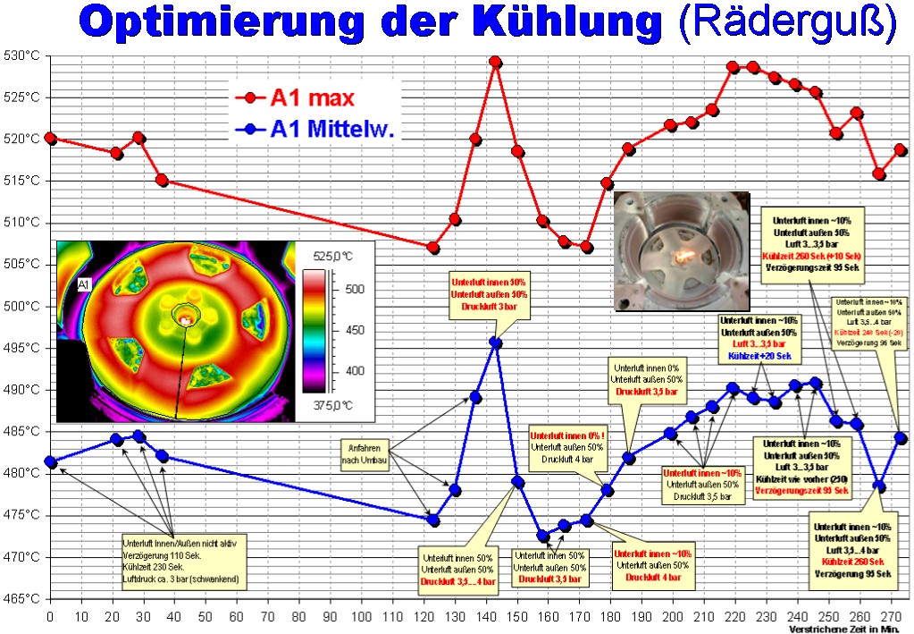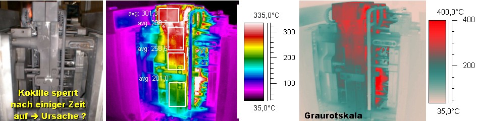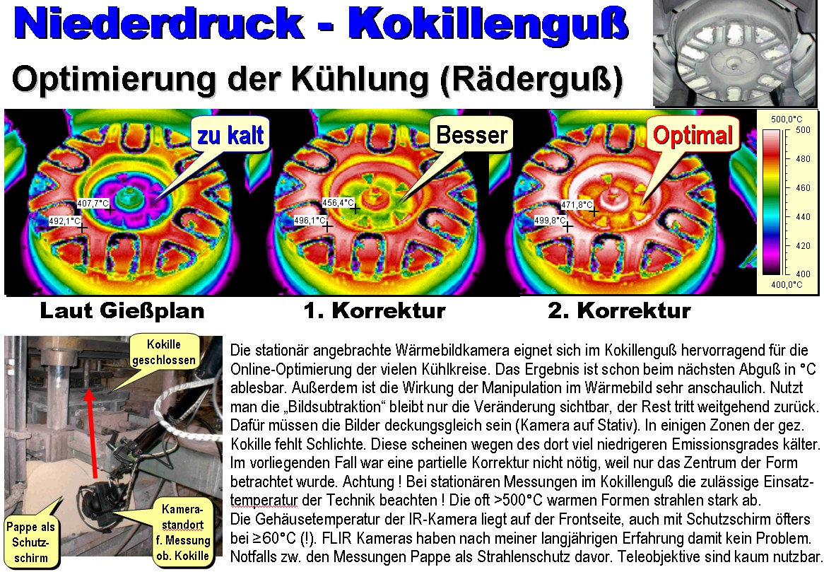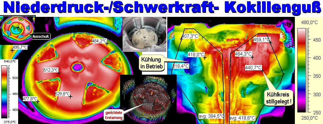 Im Al-Kokillenguß werden in Großserie vorwiegend Bauteile gefertigt, die in Fahrzeugen besonderen Beanspruchungen ausgesetzt sind. Dies sind u.a. Sicherheitsteile des Fahrwerkes, Motor- und Getriebeaufhängungen, ganze Motorblöcke, aber auch die bekannten Aluminiumräder. Wichtiger Vorteil gegenüber Al-Druckguß - kaum Poren, bedingt durch den langsamen Gieß- und Erstarrungsprozeß. Durch nachträgliche Wärmebehandlung können die Materialeigenschaften weiter verbessert werden. Der Nachteil ist die lange Zykluszeit von bis zu 5 Minuten. Dem wird durch Einsatz von Gießkarussells und effektiven Kühlstrategien entgegengewirkt. Die Gießwerkzeuge sind i.d.R. mit Schlichten beschichtet, die eine für den Thermografen sehr hilfreiche Eigenschaft aufweisen nämlich eine homogene und sehr hohe Emissivität (~0,96). Dies vereinfacht thermografische Messungen wesentlich. Absolute Genauigkeiten von +/- 10°C sind in der Praxis erreichbar, Relativmessungen noch wesentlich genauer. Oft ist die absolute Temperatur nicht so interessant, wie deren Verteilung auf der Oberfläche. Die stationäre Wärmebildkamera eignet sich im Kokillenguß hervorragend für die Online-Optimierung der vielen Kühlkreise. Das Ergebnis ist schon beim nächsten Abguß in °C ablesbar. Außerdem ist die Wirkung der Manipulation im Wärmebild sehr anschaulich. Nutzt man die Bildsubtraktion, bleibt nur die Veränderung sichtbar, der Rest tritt weitgehend zurück. Dafür müssen die Bilder deckungsgleich sein, dazu ist zu empfehlen die Kamera auf ein Stativ zu stellen. Beachtet werden muss bei stationären Messungen im Kokillenguß die zulässige Einsatztemperatur der Technik. Die oft mehr als 500°C warmen Formen strahlen stark ab. Die Gehäusetemperatur der IR-Kamera liegt auf der Frontseite, auch mit Schutzschirm öfters bei mehr als 60°C Die von mir verwendete FLIR Kamera hat nach langjähriger Erfahrung damit kein Problem. Notfalls zwischen den Messungen Pappe als Strahlenschutz vor die Kamera halten. Teleobjektive sind kaum nutzbar. |