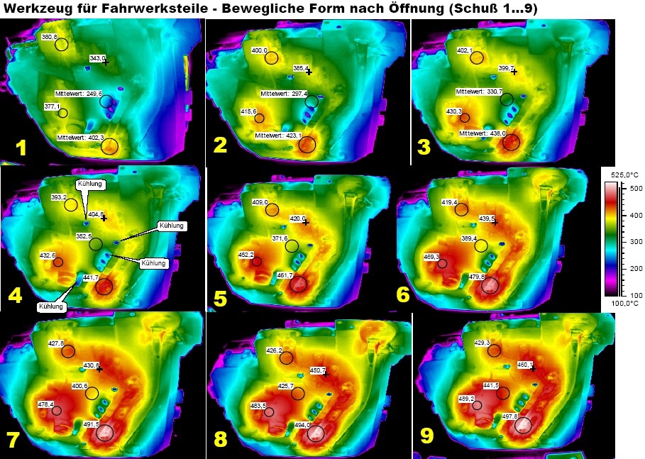 In einigen Zonen der gezeigten Kokille fehlt Schlichte. Diese scheinen wegen des dort viel niedrigeren Emissionsgrades kälter. Im vorliegenden Fall war eine partielle Korrektur nicht nötig, weil nur das Zentrum der Form betrachtet wurde. Die Optimierung erfolgte im laufenden Betrieb mit einer stationäreren Kamera durch Korrektur der Kühlzeiten. |